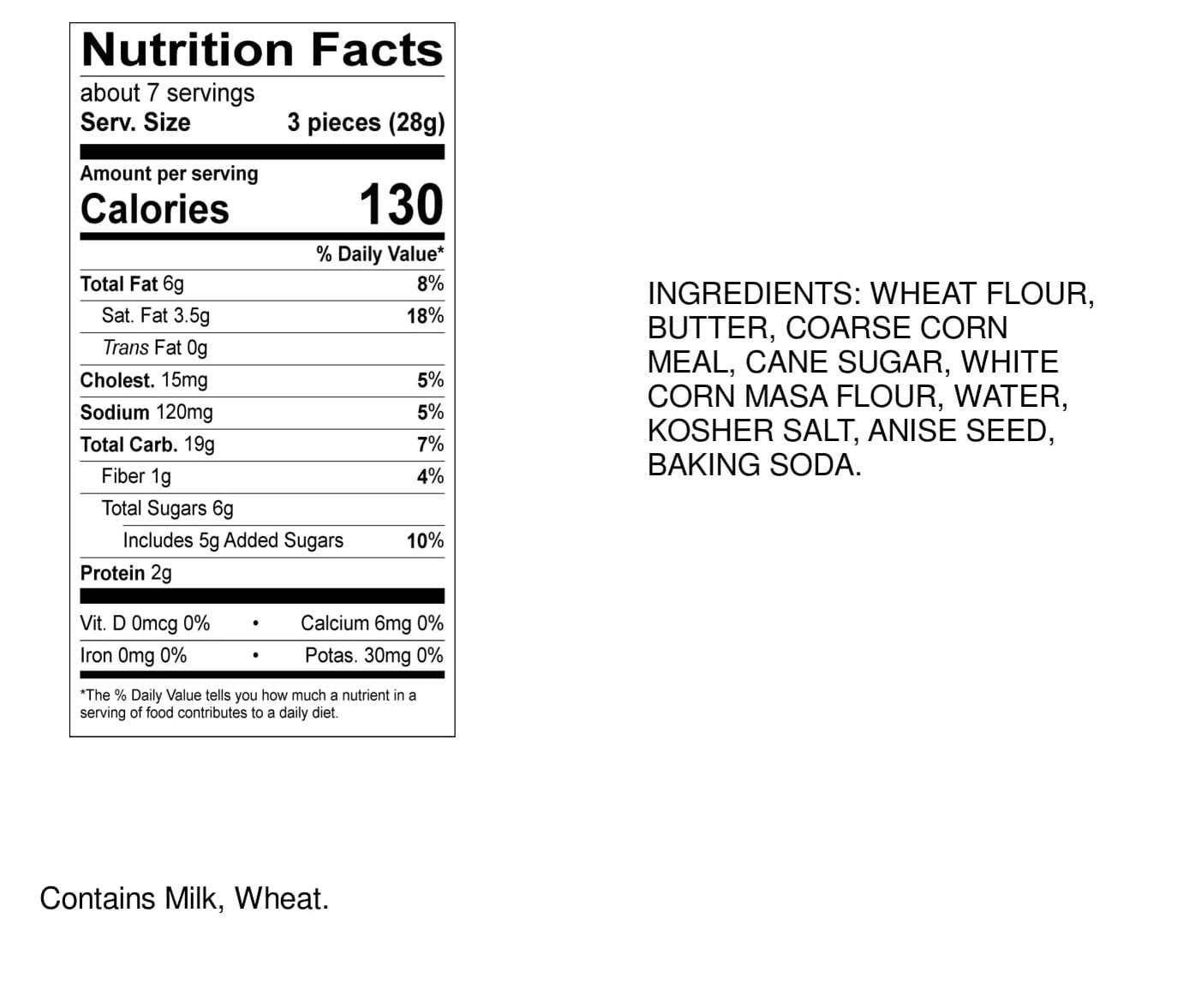 Buttery, crunchy cornmeal biscuit with an unexpected touch of anise. Perfect with coffee or a spread of fresh chèvre and red pepper jelly