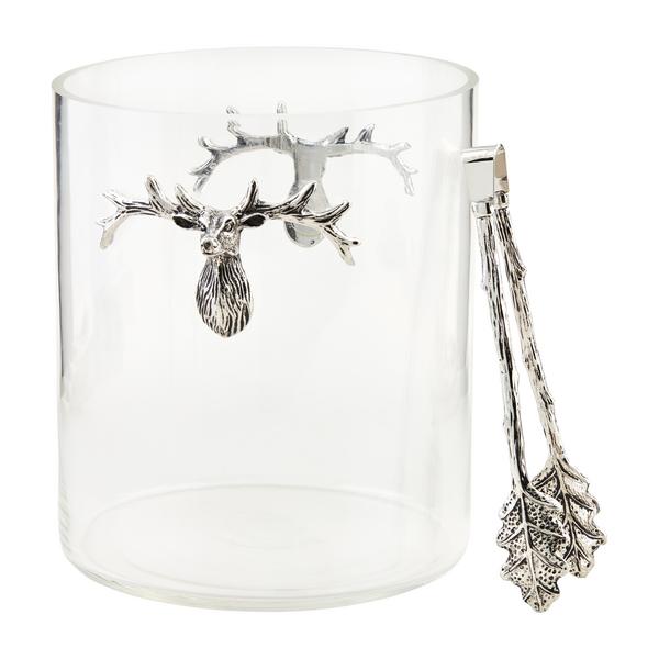 The Deer Ice Bucket & Tong Set is a stylish and functional addition to any home bar or entertaining space. This 2-piece set includes a glass ice bucket and coordinating leaf tongs. The ice bucket is crafted from high-quality glass and features cast aluminum deer side handles, adding a touch of rustic charm to the design. With a size of 8" x 7" in diameter, the bucket provides ample space to hold a generous amount of ice for your favorite beverages. The coordinating leaf tongs, measuring 7 1/2" in length, make it easy to grab and serve ice cubes with precision and style. Whether you're hosting a dinner party or enjoying a quiet evening at home, this Deer Ice Bucket & Tong Set is sure to impress your guests and elevate your drink service.