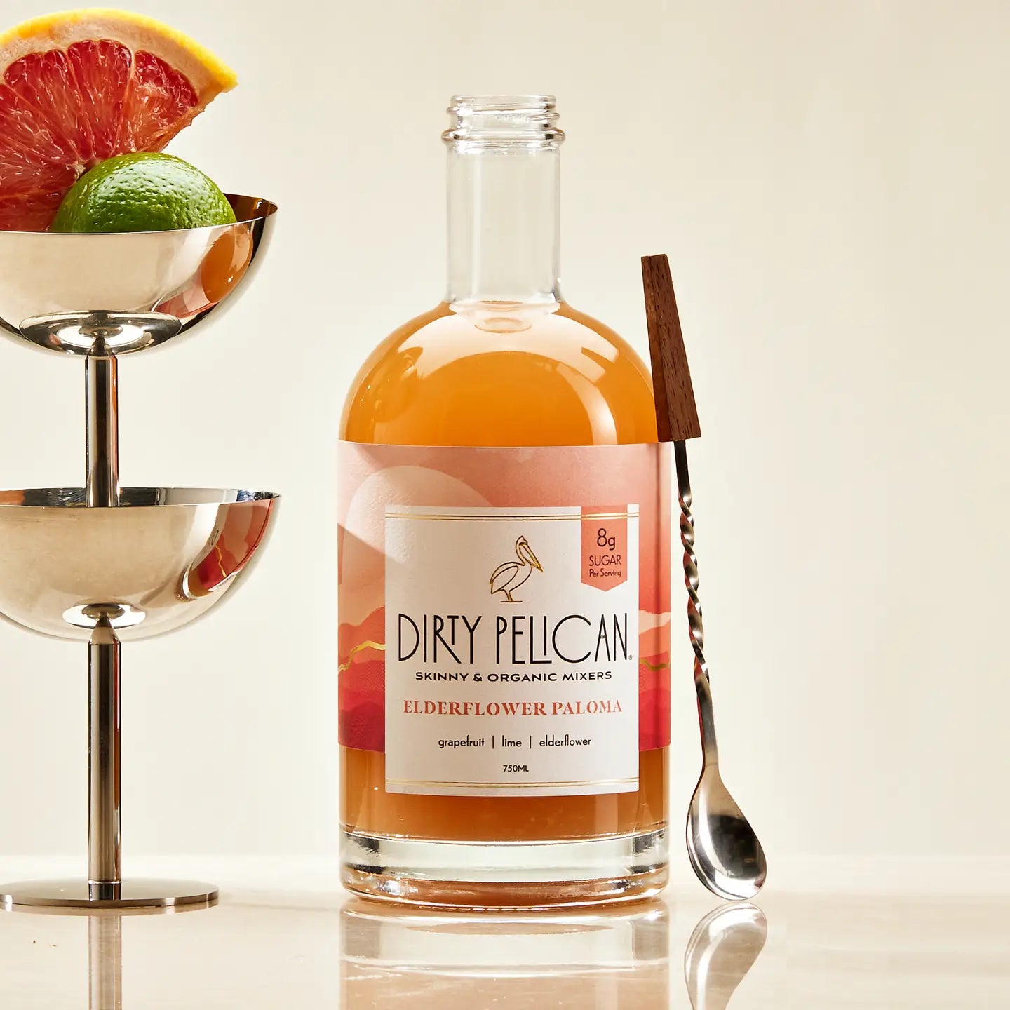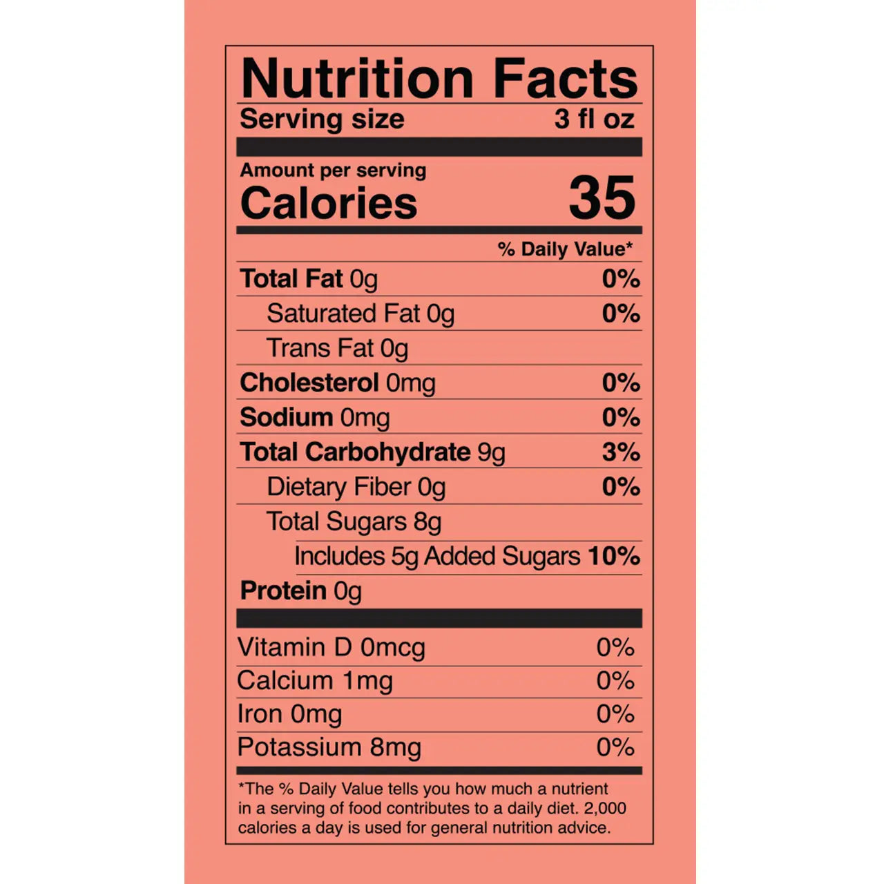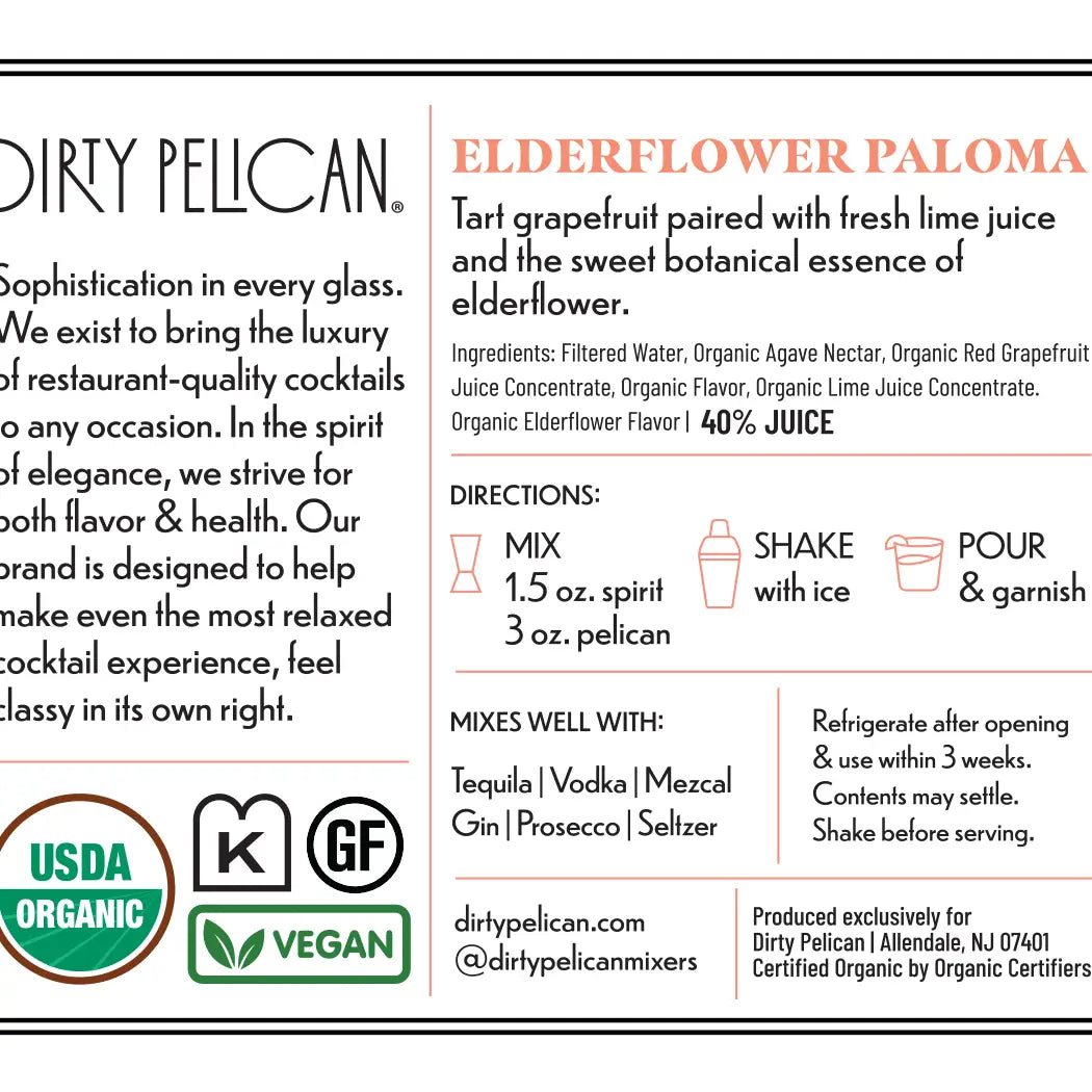 Tart grapefruit paired with fresh lime juice and the sweet botanical essence of elderflower. We chose our grapefruits from Argentina because they have a more gentle bitterness to them, than a traditional grapefruit we typically have in the USA. The elderflower touch in this mixer is gentle & on the backend. We purposely crafted the recipe this way so nothin in this drink is over powering the other. Ingredients: Filtered Water, Organic Agave Nectar, Organic Red Grapefruit Juice Concentrate, Organic Flavor, Organic Lime Juice Concentrate, Organic Elderflower Flavor | 40% Juice No High Fructose Corn Syrup, No Citric Acid, No Preservatives Nutritional Facts: Serving Size: 3oz, Calories 40 | Total Fat 0 | Cholesterol 0 | Sodium 0 | Carbs 10g | Fiber 0 | Total Sugars 10g (includes 6g added sugar, 12% DV) | Protein 0 | Vitamin D 0 | Calcium 1mg (0% DV) | Iron 0 | Potassium 8mg (0% DV)
