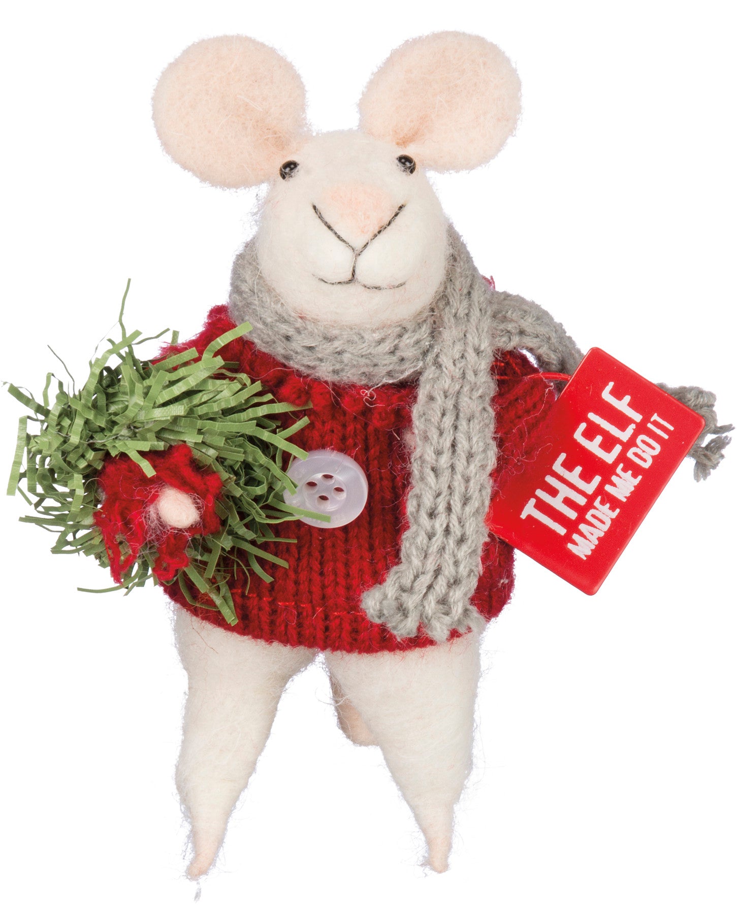 A Christmas-themed felt critter lending a "The Elf Made Me Do It" sentiment, knit sweater scarf detail, bristled wreath accent, and clear filament hanger for easy decorating. Great to display with other critter styles. This is not a toy.