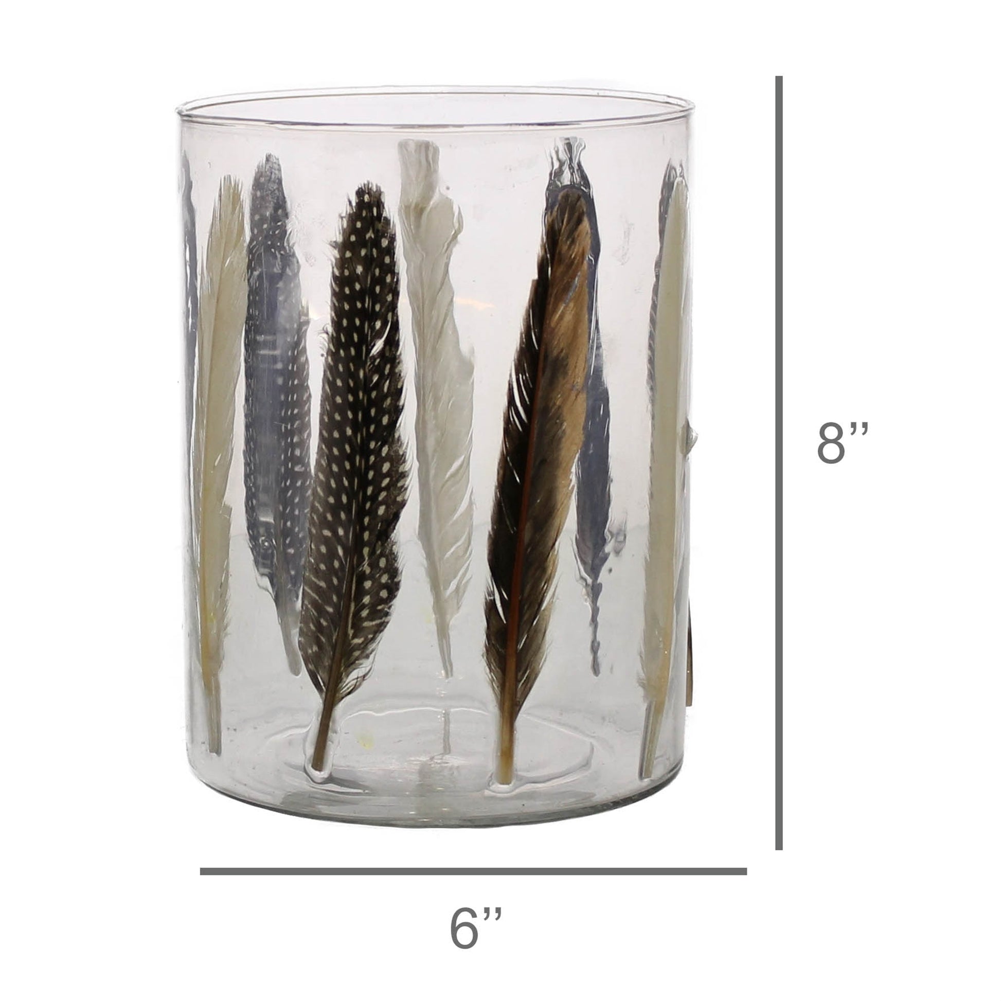 Earthen materials appropriated from nature are forever conserved in our Enamel Hurricane Collection. Feathers are enameled onto simple glass silhouettes presenting an intriguing luminary for a candle or flower vessel. Made by HomArt.