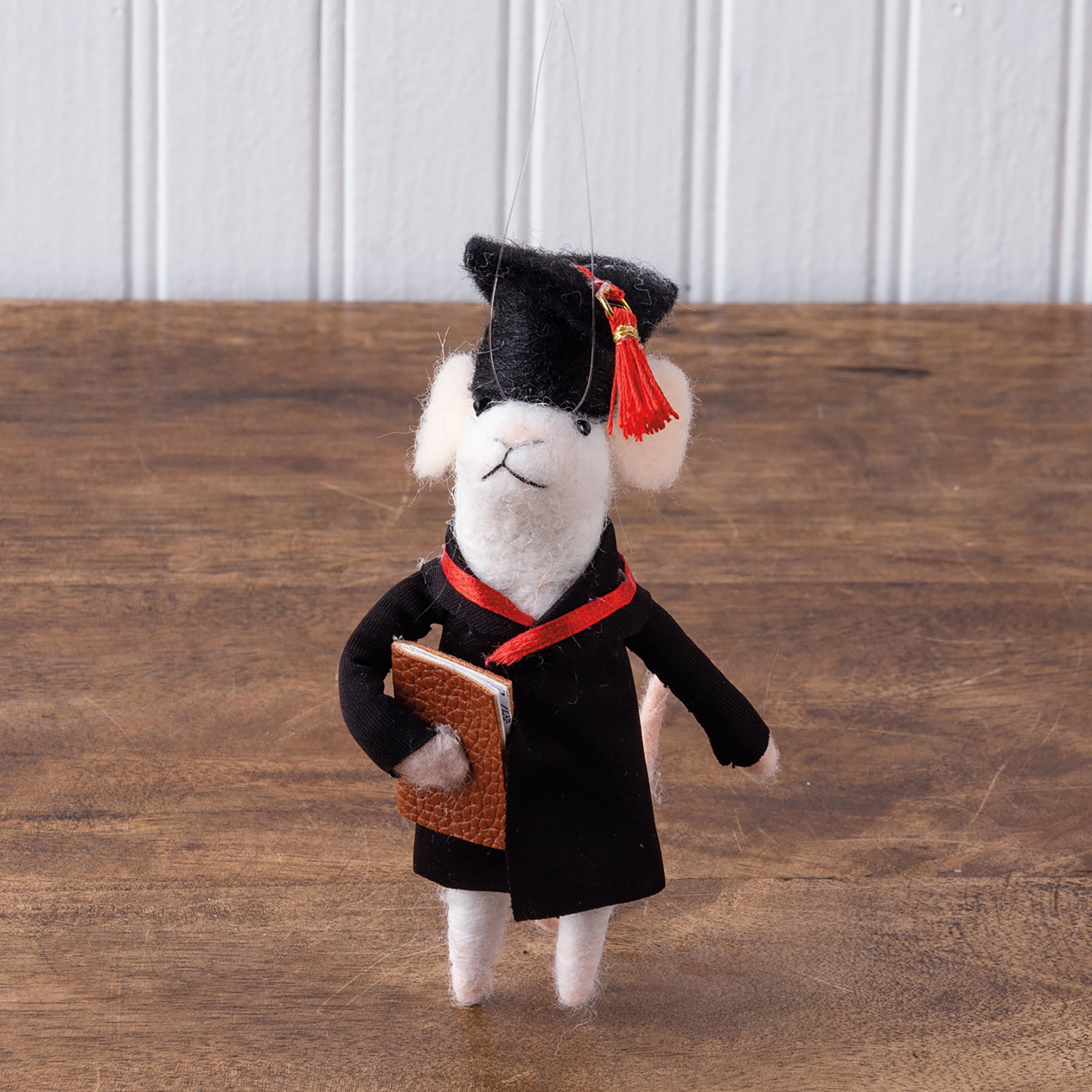 A felt critter featuring a mouse wearing a graduation cap and gown and holding a diploma. Our Graduate Mouse critter easily hangs via attached loop. This is not a toy.