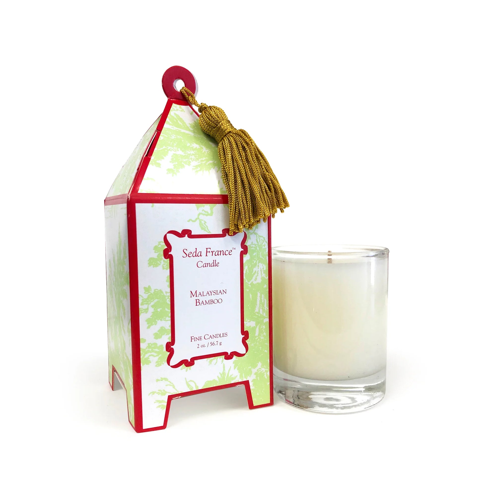Peninsular Malaysia is home to some of the largest and most culturally important bamboo forests in the world, where it is used to make everything from baskets to paper to sustainable building materials. Our tribute to this majestic plant is as crisp and natural as the bamboo itself, beginning with a layer of fresh green wood followed by the earthiness of amber and sandalwood, and finished off with a lightly floral grouping of tangerine flower, jasmine, freesia, lotus and tuberose. All our best-selling Classic Toile fragrances are available in this Mini Pagoda version of our signature "no wrapping paper needed" packaging, with a glass votive inside. Hand-poured candles, 2 ounces, burn time of 15-20 hours, and always the perfect gift.