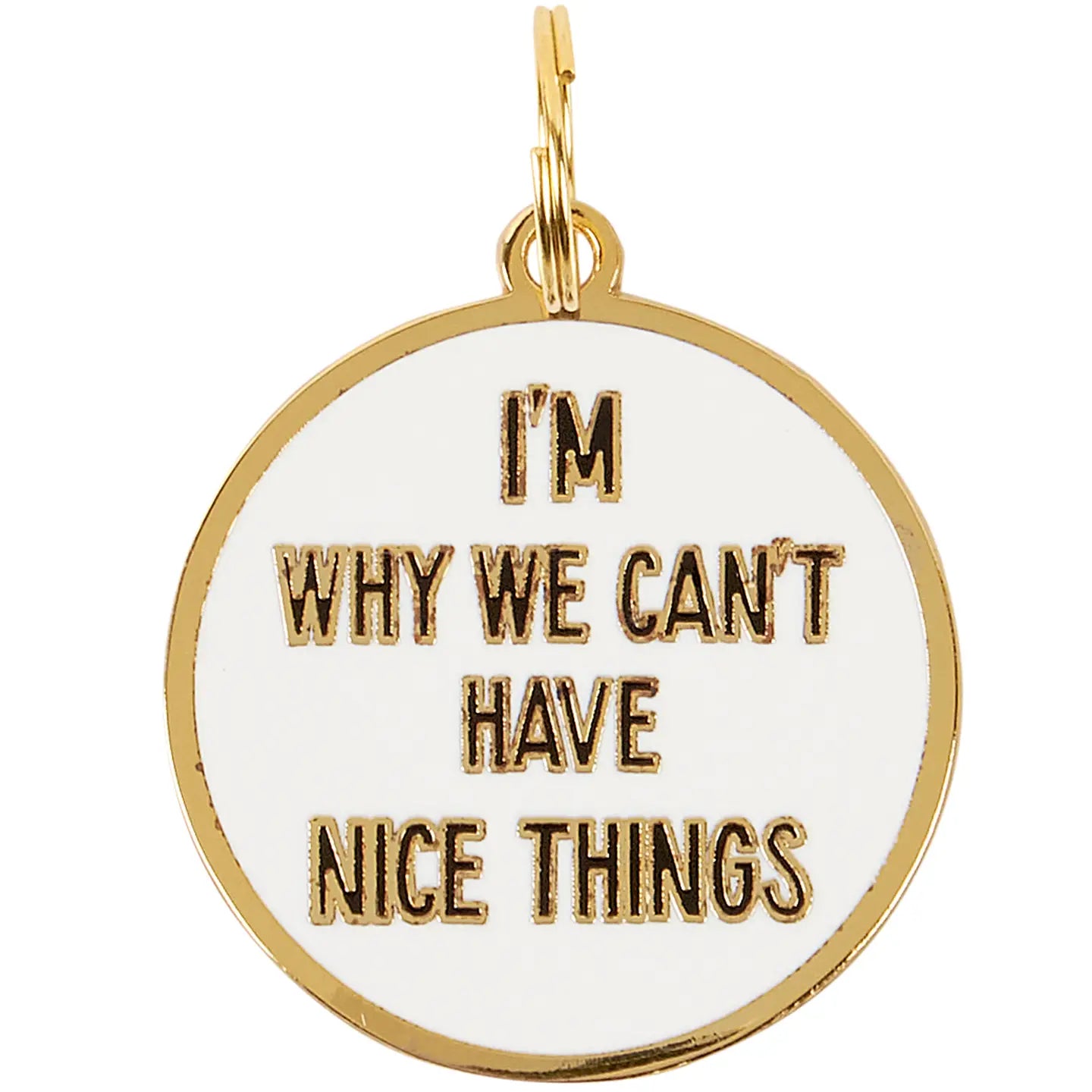 A high-quality, hard enamel collar charm from our Pet Collection displaying a fun pet-themed sentiment that reads "I'm Why We Can't Have Nice Things" with gold accents to add playful personality! Our Nice Things collar charm is attached to an illustrated dog backer card inside a plastic bag making it great for gifting. Back of collar charm is safe to engrave without damaging front enamel. A fun pet accessory perfect for everyday use.