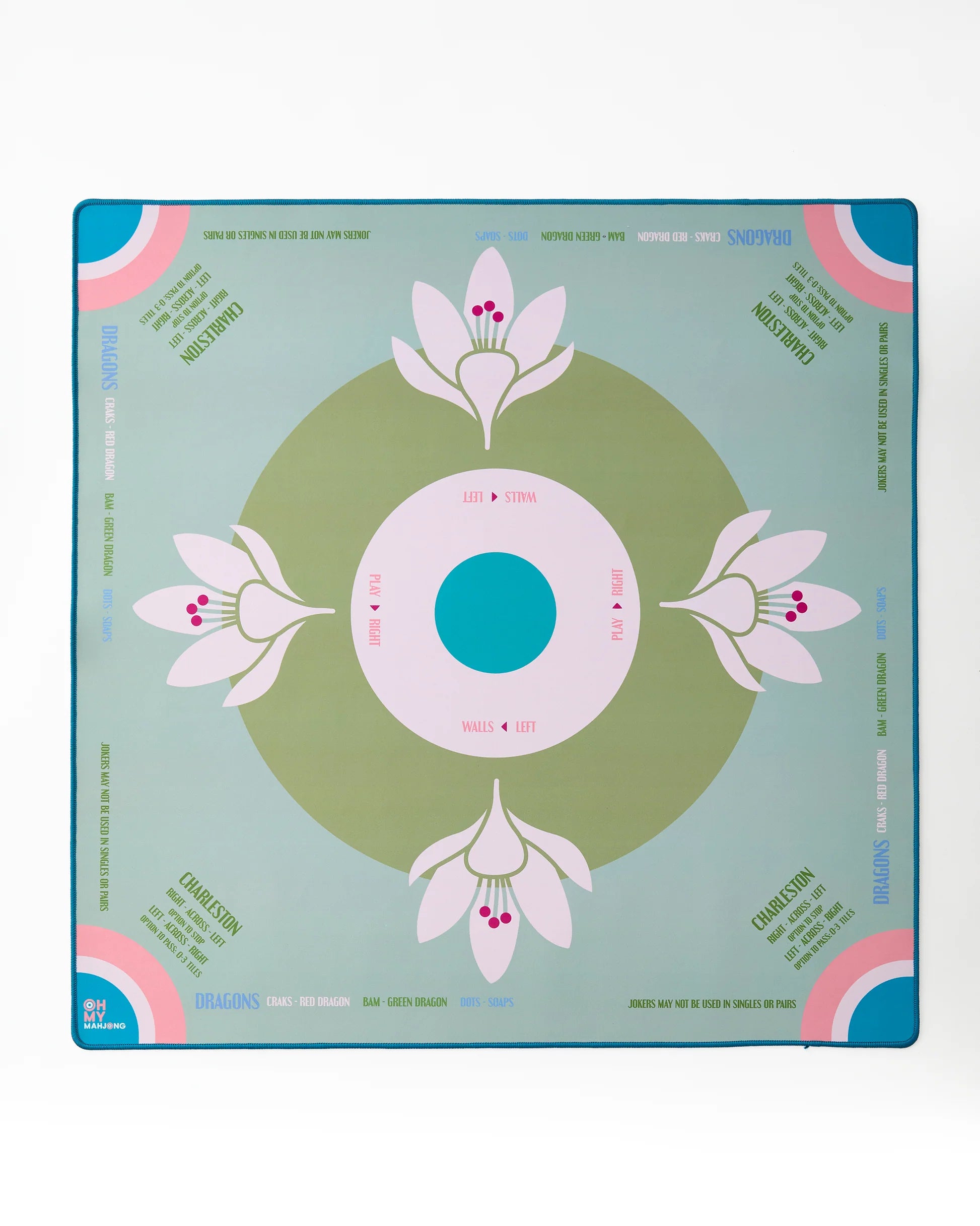 Feast your eyes on the Sage Lotus Mahjong Mat –– a mesmerizing collection of sage greens, delicate pinks, and serene blues that guide you into tranquility and elegance. This mat is more than just a beautiful backdrop for your games –– it's a mix of style and practicality. With its soothing colors and intricate design, prepare to be transported to a tranquil garden oasis that sets the stage for hours of immersive gameplay. The helpful addition of essential rules for American Mahjong are placed along the sides. Let's not forget its practical side –– with a non-slip surface that ensures stability and precision.