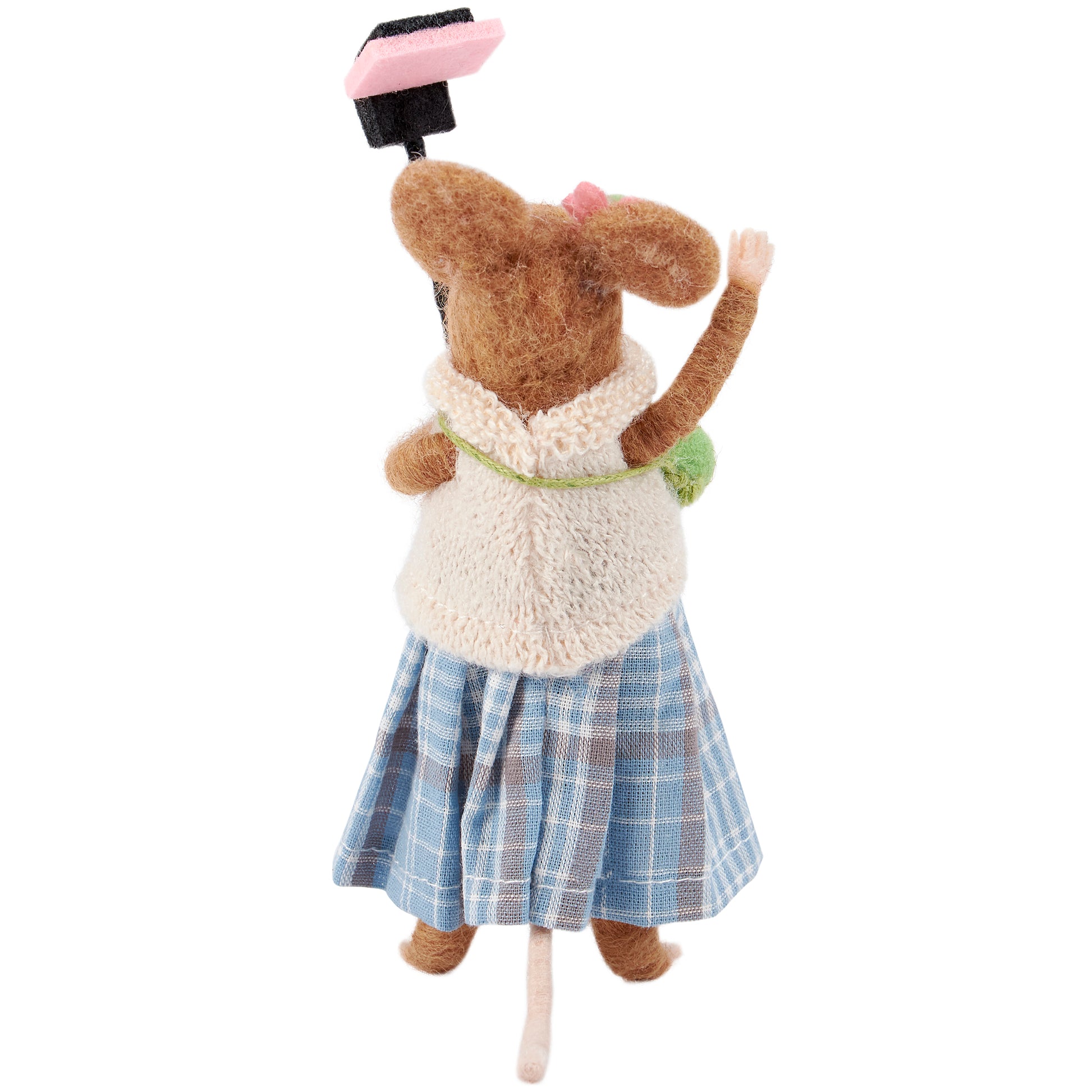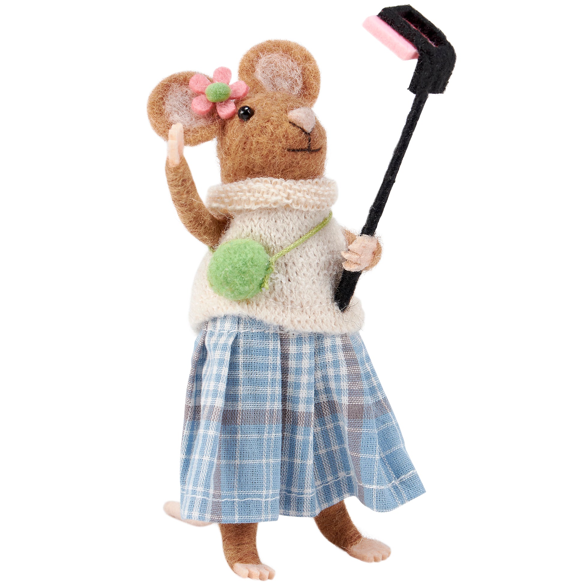 A felt critter from our Felt Collection displaying a stylish mouse holding a selfie stick design perfect for adding character to any space. Mouse critter features cute handmade details including knit sweater and felt flower on the ear. Our Selfie Stick Mouse critter is designed to free-stand on flat surface for display. Contains small parts; this is not a toy. A fun everyday home accent that displays well alone or as a collection with other critters.