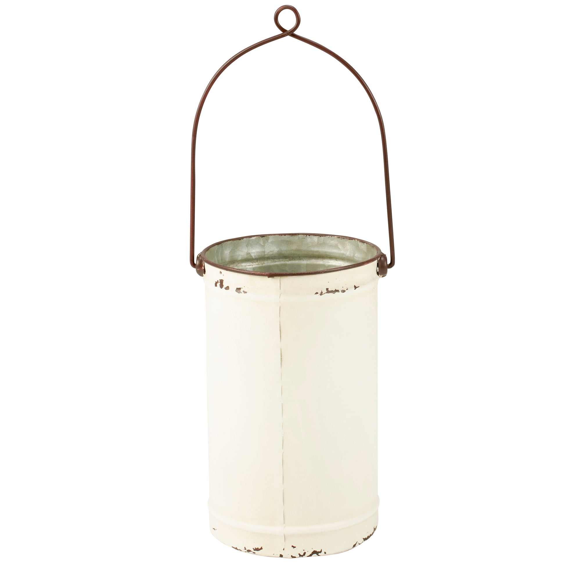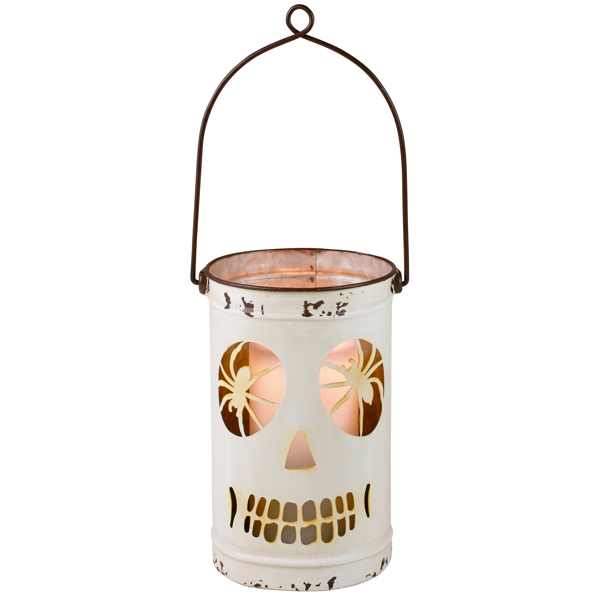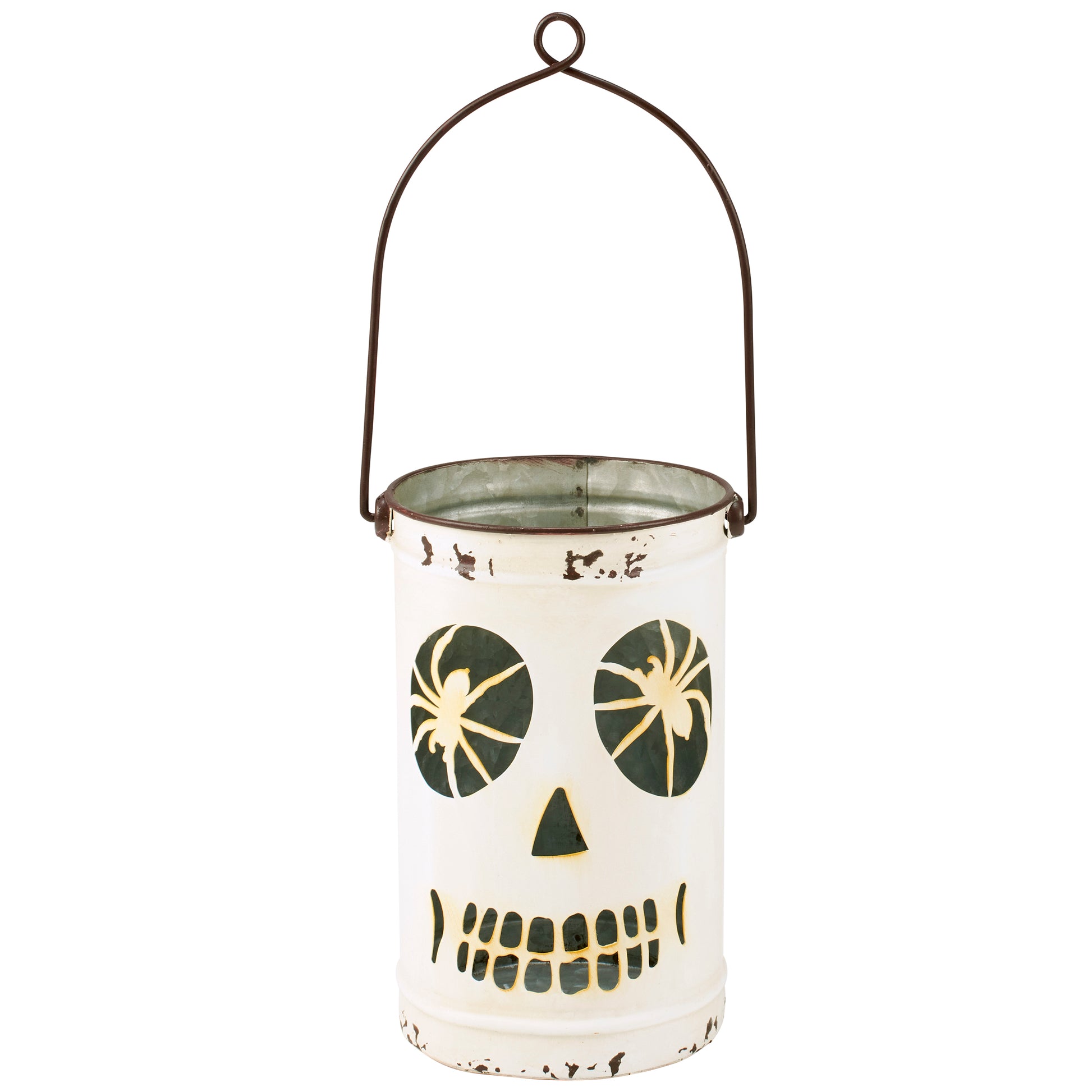 A metal lantern from our Halloween Collection displaying a skull design with a spider in each eye and white paint finish with distressed details. Lantern includes space to place various light sources and features cutout details to illuminate skull design. Candle pictured not included. Our Skull lantern includes a metal handle with loop at the top to carry or hang for display. A rustic seasonal home accent with a variety of display options.