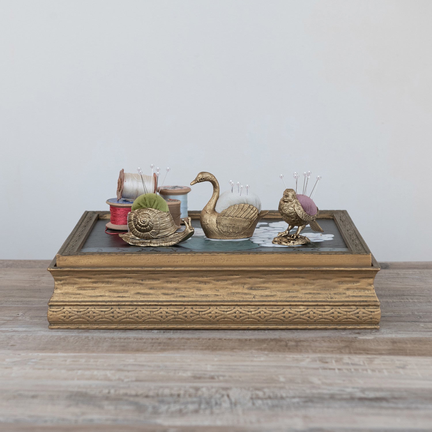 Approximately 3"L Metal Swan/Snail/Bird Shaped Velvet Pin Cushion w/ 5 Pearl Head Pins, Gold Finish