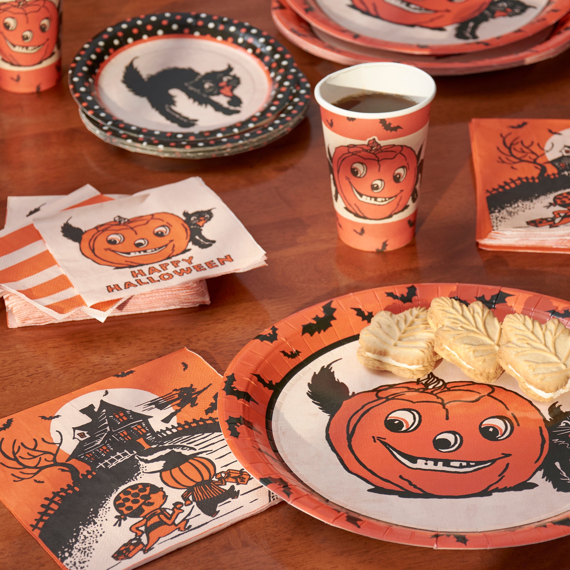 Perfect for customizing place settings and making clean-up a breeze, this small disposable paper napkin from our Halloween Collection displays a vintage design of a jack o'lantern and black cat above a "Happy Halloween" sentiment with orange and cream stripes on the back. Our Vintage Halloween beverage napkin measures 5" x 5" and comes shrink-wrapped in a set of 20 napkins. A fun tabletop accessory for seasonal gatherings.
